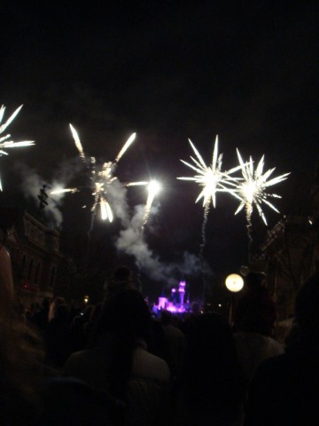 ディズニーにある乗り物のテーマソングが順番に流れてきて、それに合わせて花火があがるんだけどさ