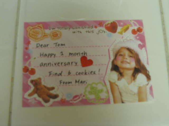 ちなみにメモには「Happy 1 month anniversary. Find 6 cookies!」って書いてありますw