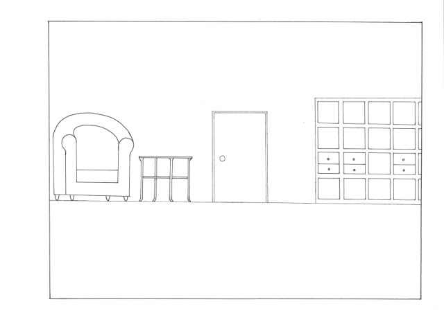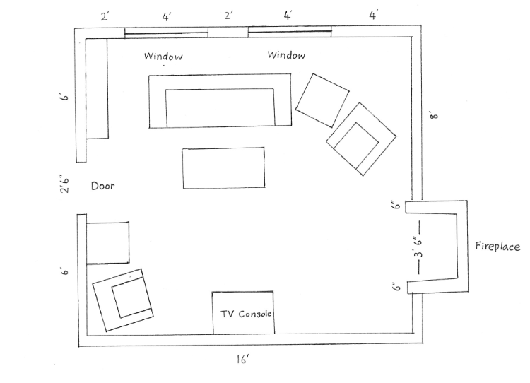 ところどころにある正方形はサイドテーブル、そんで左上の長細いのは本棚です。